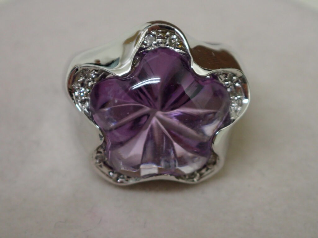このリングは、18金ホワイトゴールドの上品な輝きと、中央のアメジストと小さなダイヤモンドの組み合わせが美しいフラワーデザインです。例えば、手元を華やかに演出し、フォーマルから普段使いまで幅広く対応可能です。