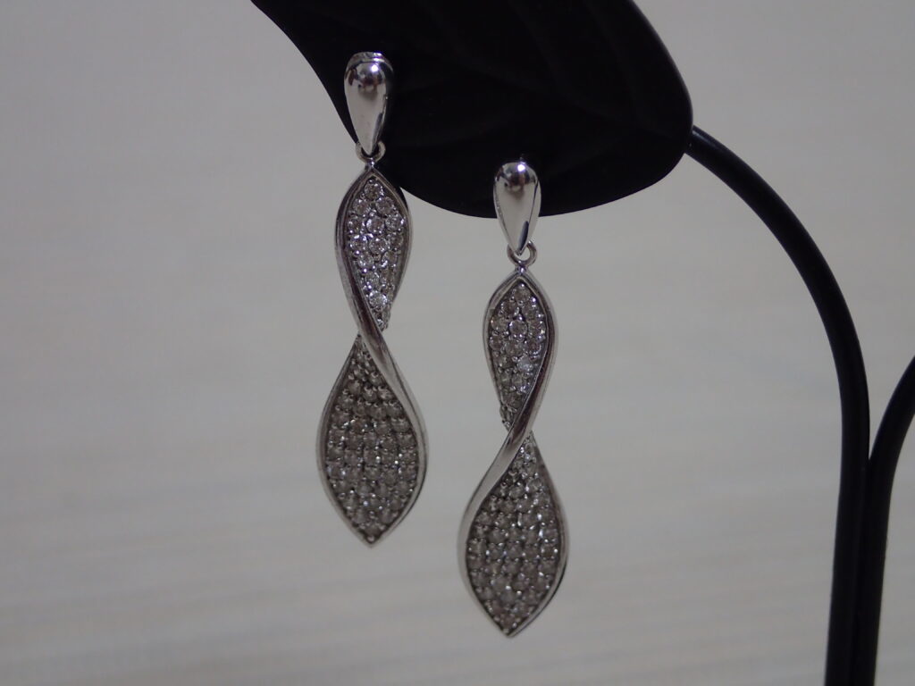 このピアスはK18ホワイトゴールド製で、0.8ctのダイヤモンドを使用したウェーブデザインです。例えば、光の加減でダイヤモンドがさりげなく輝き、上品な印象を与えます。また、ウェーブデザインは耳元を柔らかく演出し、年代を問わず人気です。さらに、軽量でつけ心地が良く、長時間でも快適に装着できます。このように、デザイン性と素材の良さが揃った逸品です。