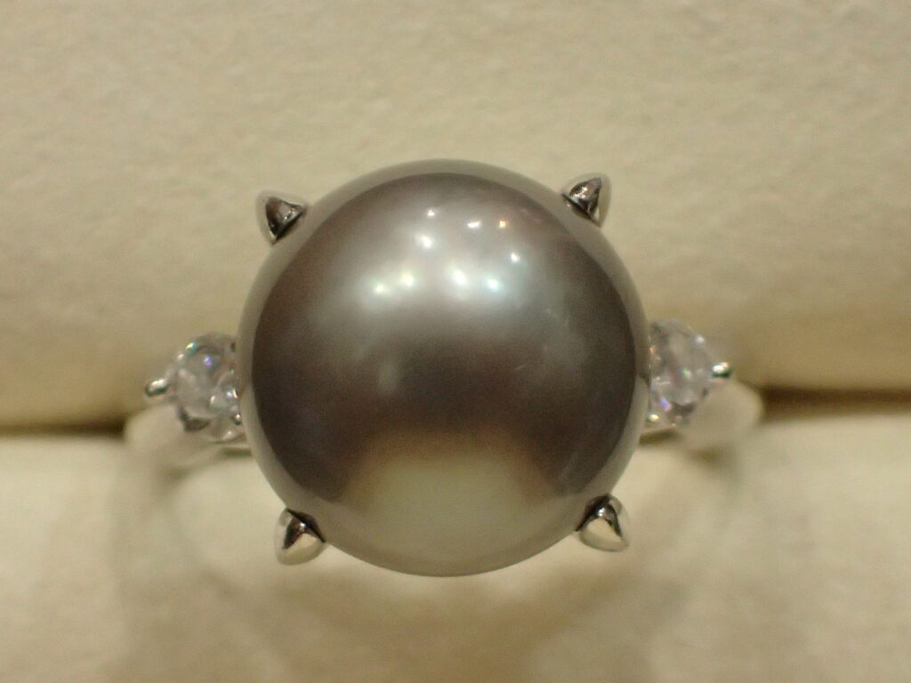 この指輪は、深い色合いが魅力の黒蝶真珠(ブラックパール)12ミリが主役です。