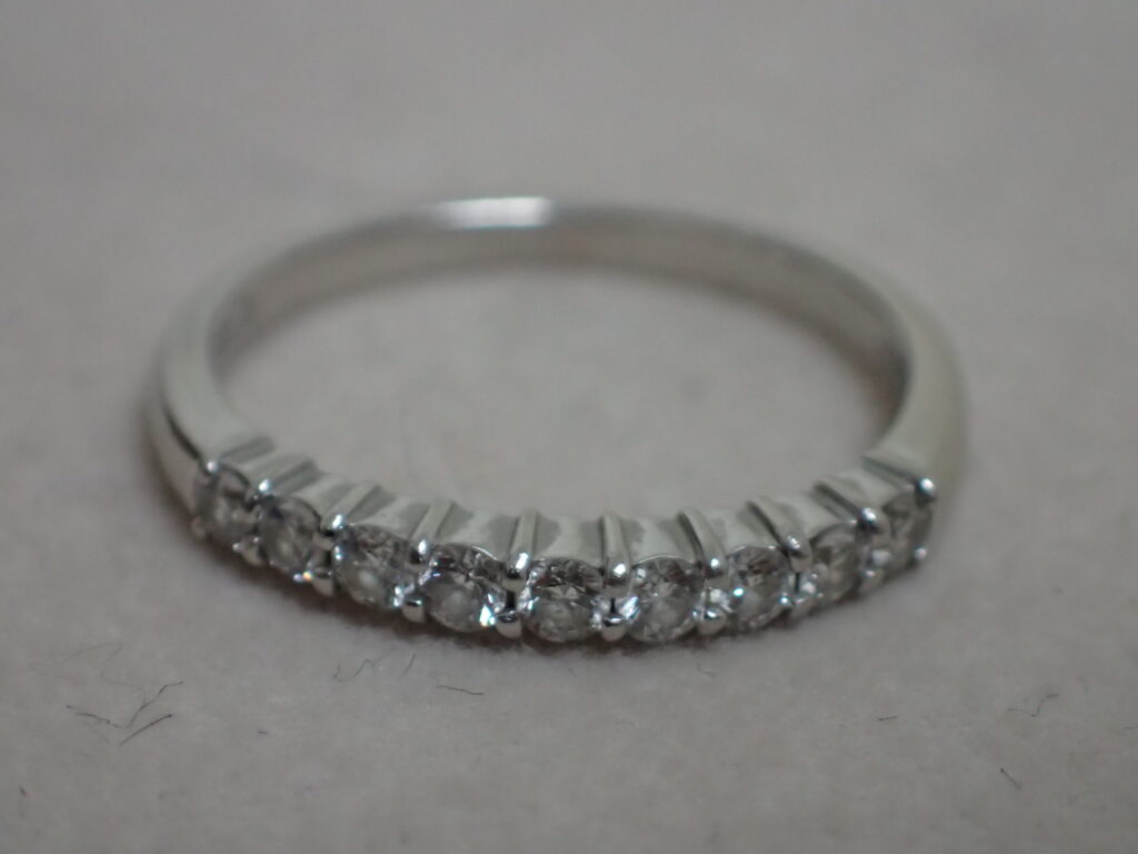 このリングはPt900プラチナ製で、ダイヤモンドを一周半にあしらったハーフエタニティデザインです。例えば、光があたるとダイヤモンドが繊細に輝き、手元を華やかに演出します。また、ハーフエタニティは日常使いにも向いており、年代を問わず人気です。さらに、プラチナ素材は耐久性が高く、長く愛用できる点も魅力です。このように、デザイン性と素材価値が揃った逸品です。